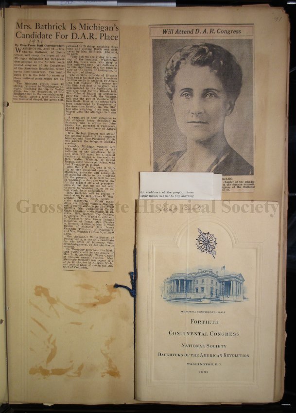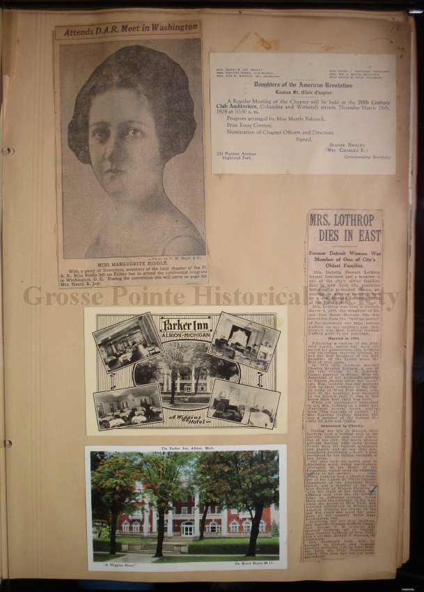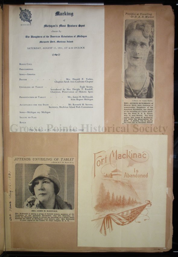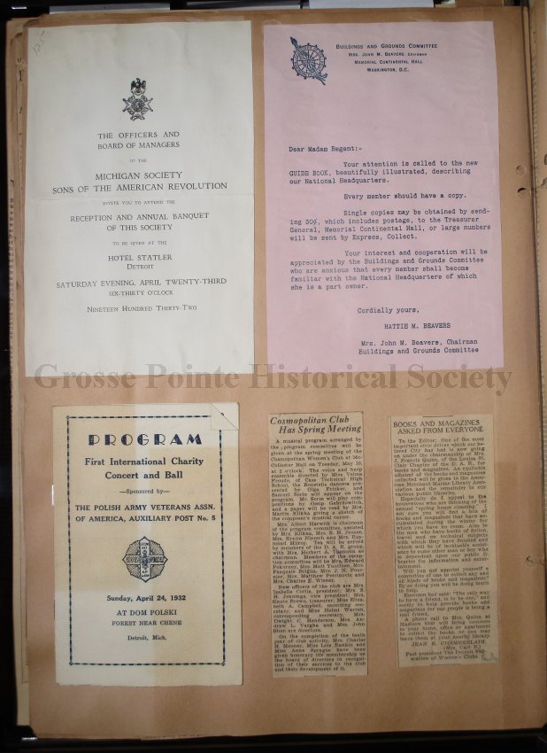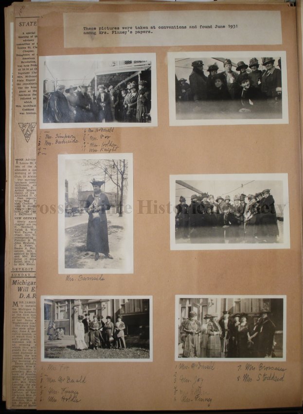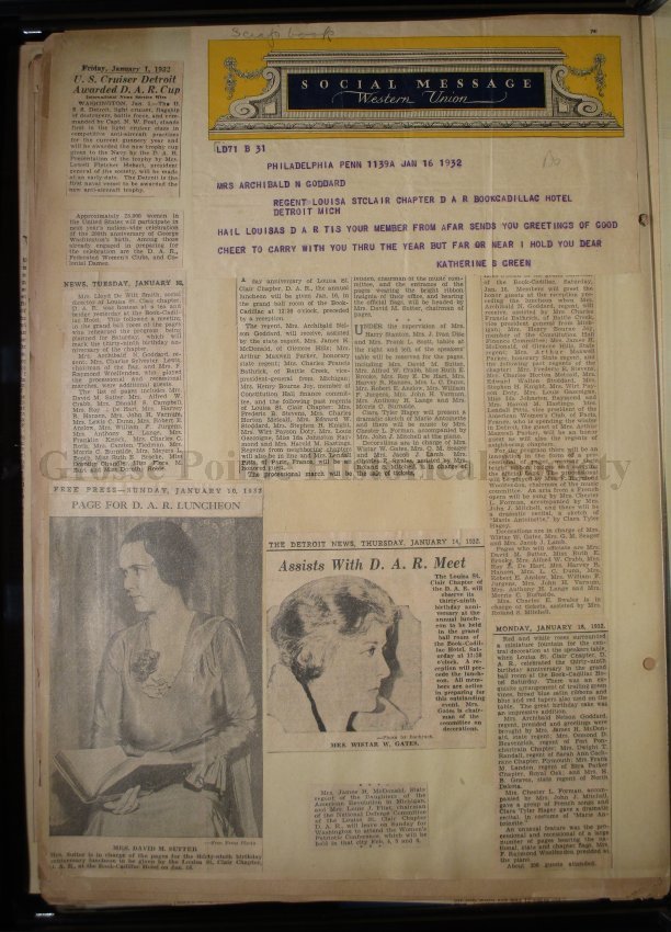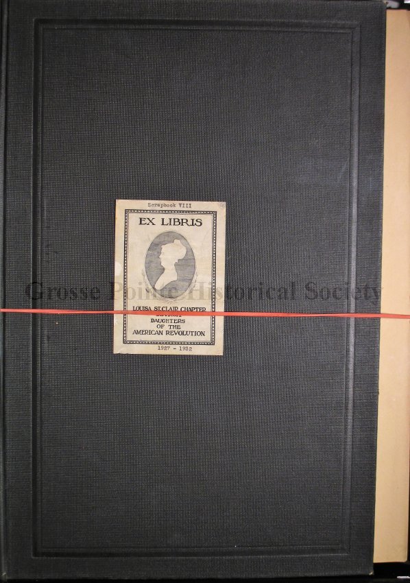 This scrapbook is part of the Louisa St. Clair Chapter, DAR Scrapbook Collection. This collection is owned by the Louisa St. Clair Chapter, DAR, and is housed at their climate-controlled storage unit in Grosse Pointe, MI.