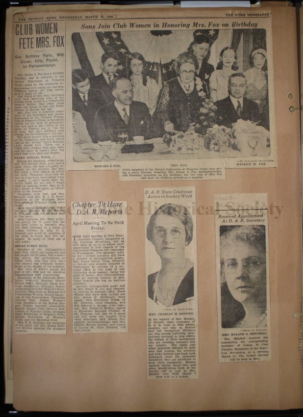 123 Reports of birthday luncheon given for Mrs. Emma A. Fox, and the April meeting of Fort Pontchartrain chapter DAR.