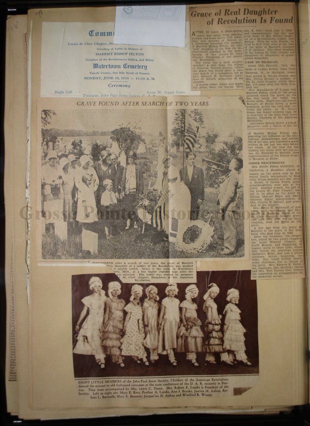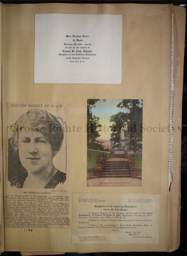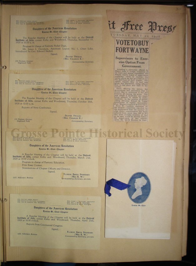 Grosse Pointe Historical Society and its patrons have no rights to use or reproduce items owned by the Louisa St. Clair Chapter DAR without written consent of the Executive Committee of the Chapter. Use and reproduction fees may apply.