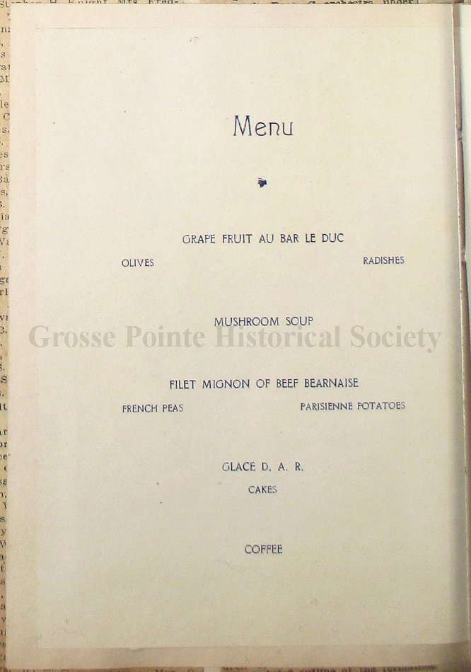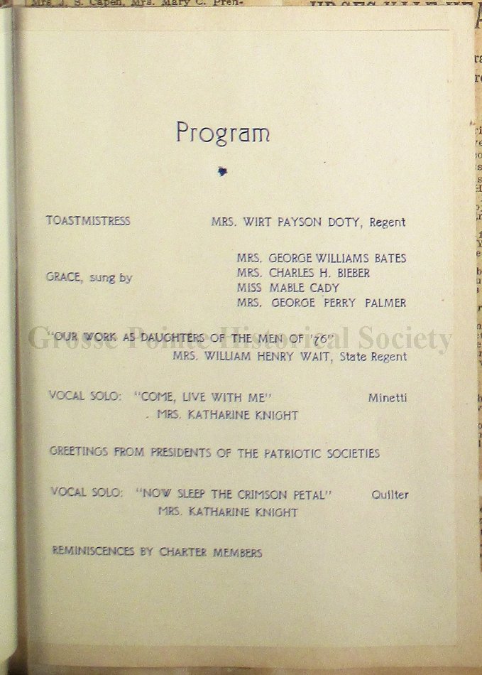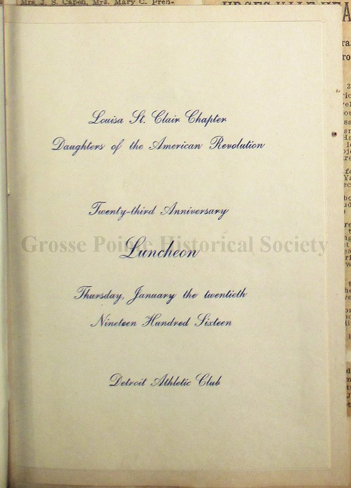 Grosse Pointe Historical Society and its patrons have no rights to use or reproduce items owned by the Louisa St. Clair Chapter DAR without written consent of the Executive Committee of the Chapter. Use and reproduction fees may apply.