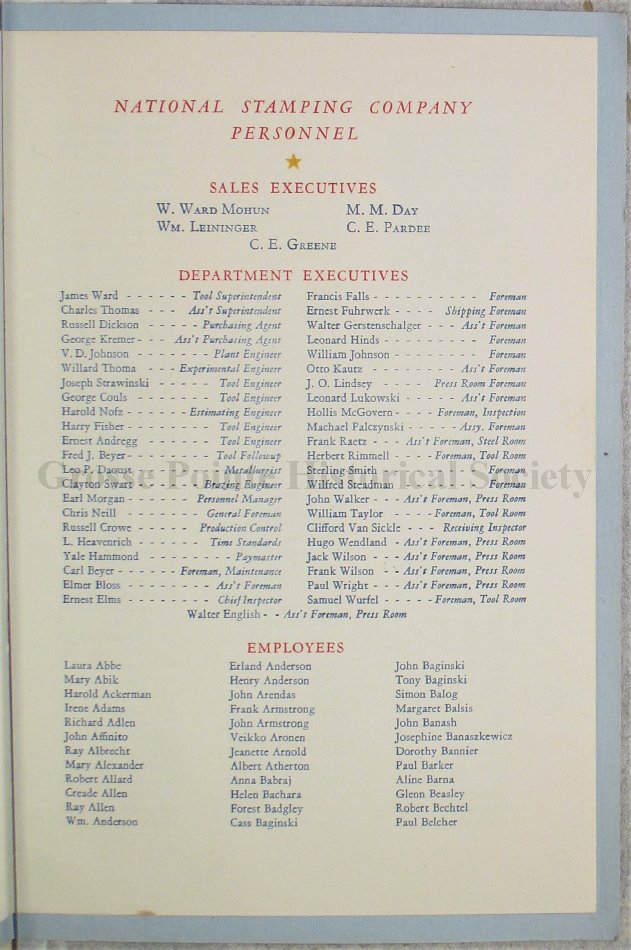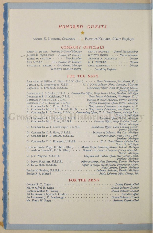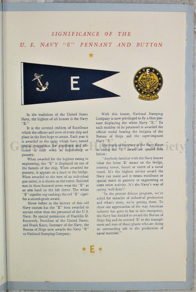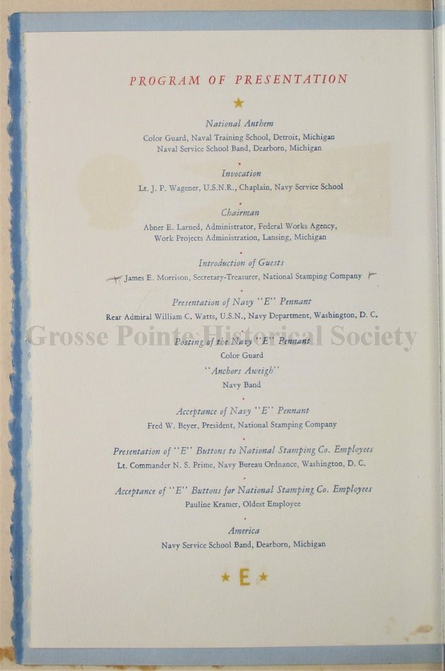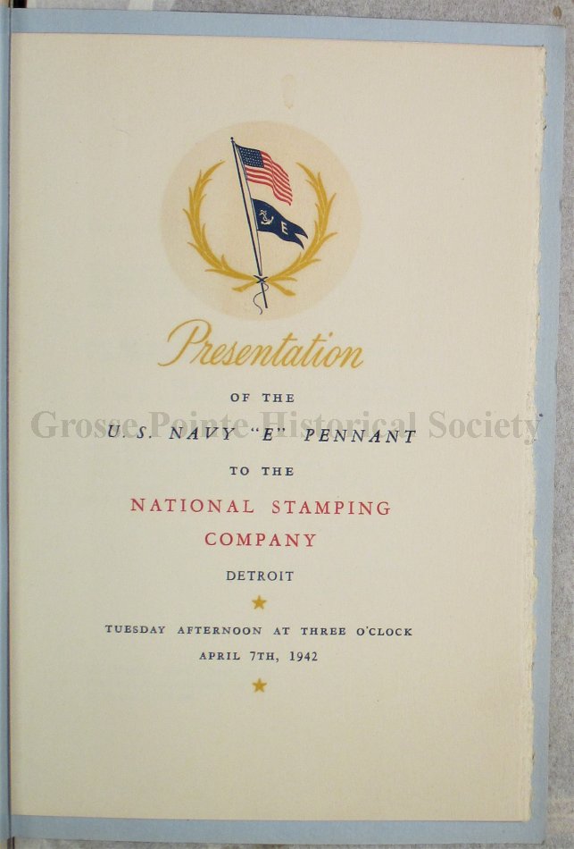 Program for the Presentation of the U.S. Navy "E" Pennant to the National Stamping Company, Detroit.