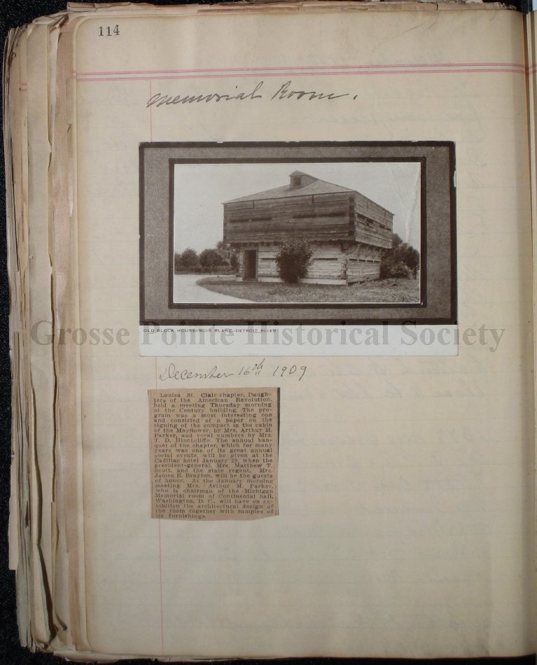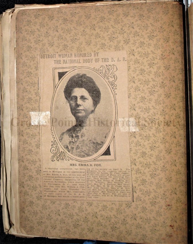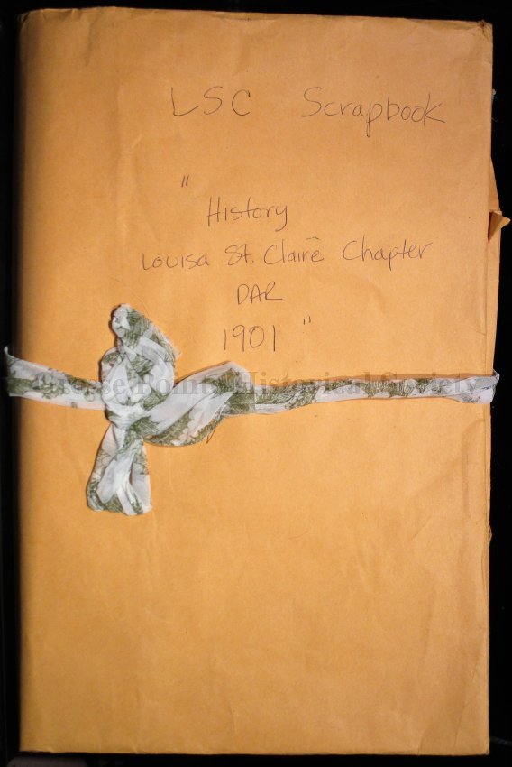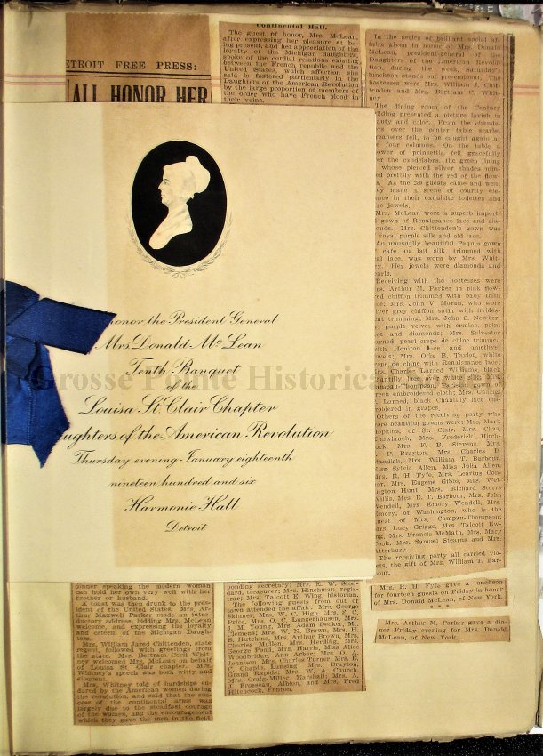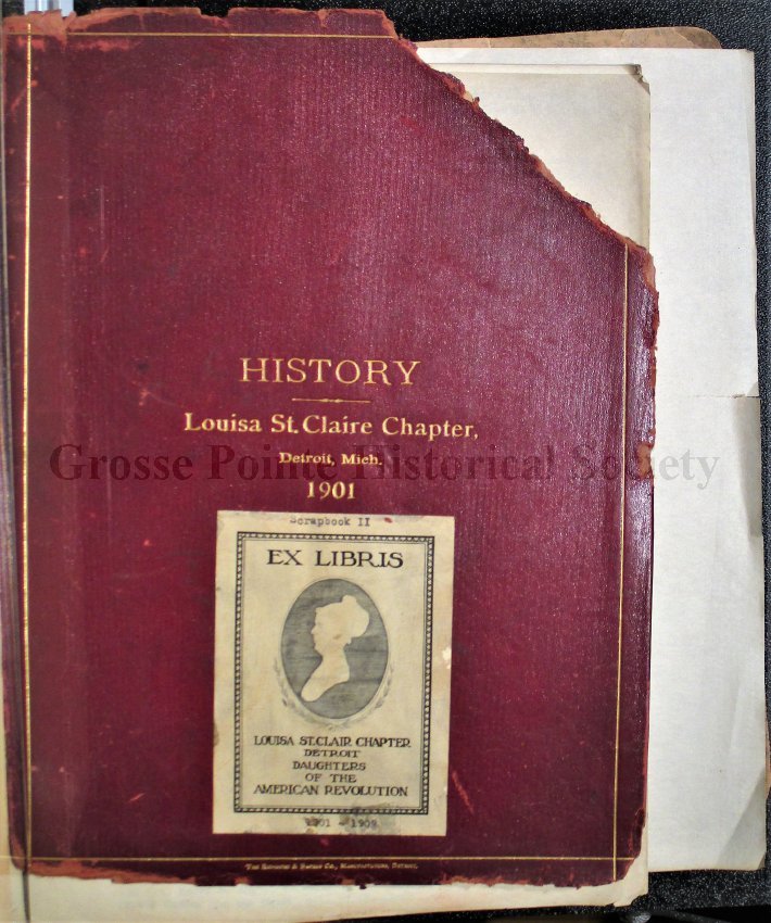 This scrapbook is part of the Louisa St. Clair Chapter, DAR Scrapbook Collection. This collection is owned by the Louisa St. Clair Chapter, DAR, and is housed at their climate-controlled storage unit in Grosse Pointe, MI.