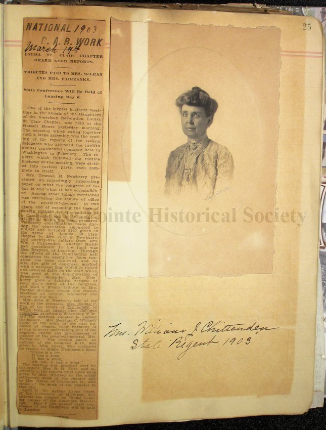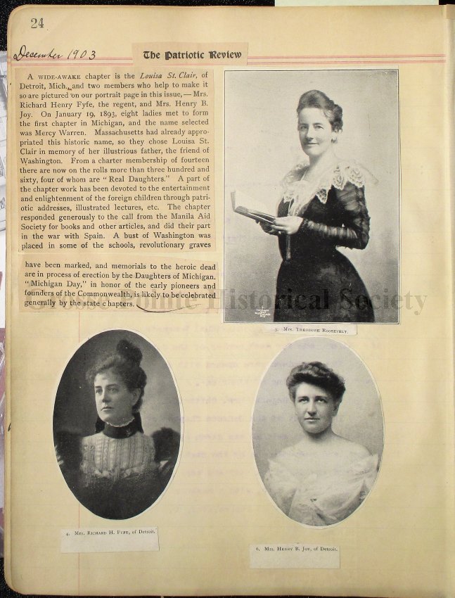 24 Clipping from The Patriotic Review of December, 1903, outlining the work of “the wide-awake chapter, the Louisa St. Clair of Detroit, Michigan”, and picturing “two members who help make it so, Mrs. Richard H. Fyfe, the Regent, and Mrs. Henry B. Joy”. It tells of the organization on January 19, 1893, of its growth during the ten years, and of its work.
