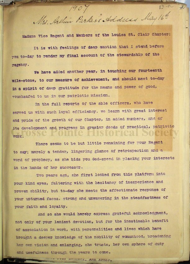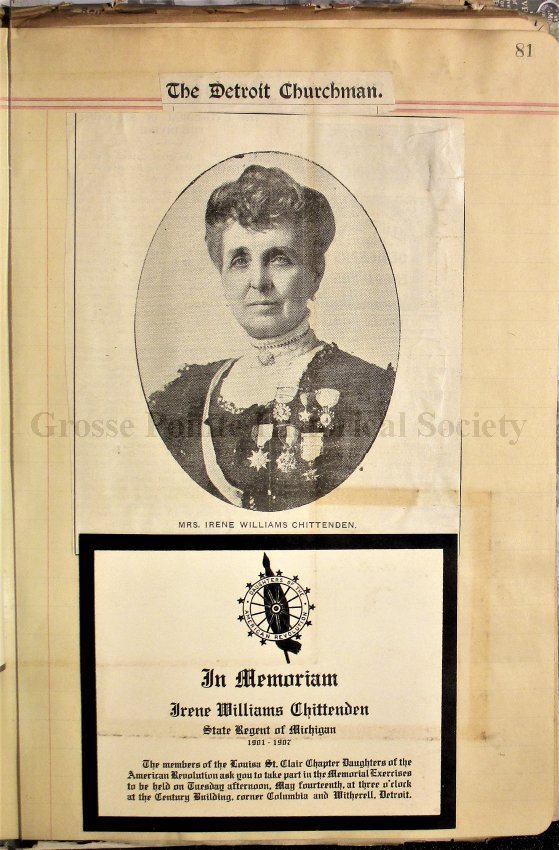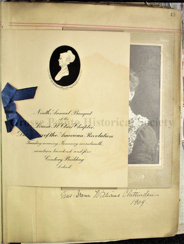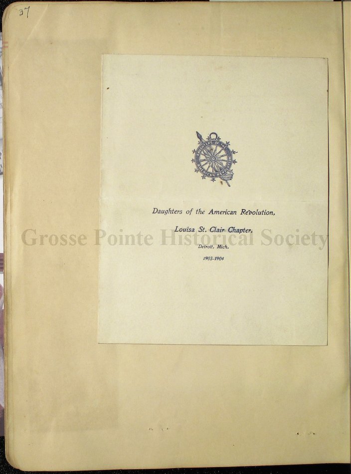 Grosse Pointe Historical Society and its patrons have no rights to use or reproduce items owned by the Louisa St. Clair Chapter DAR without written consent of the Executive Committee of the Chapter. Use and reproduction fees may apply.
