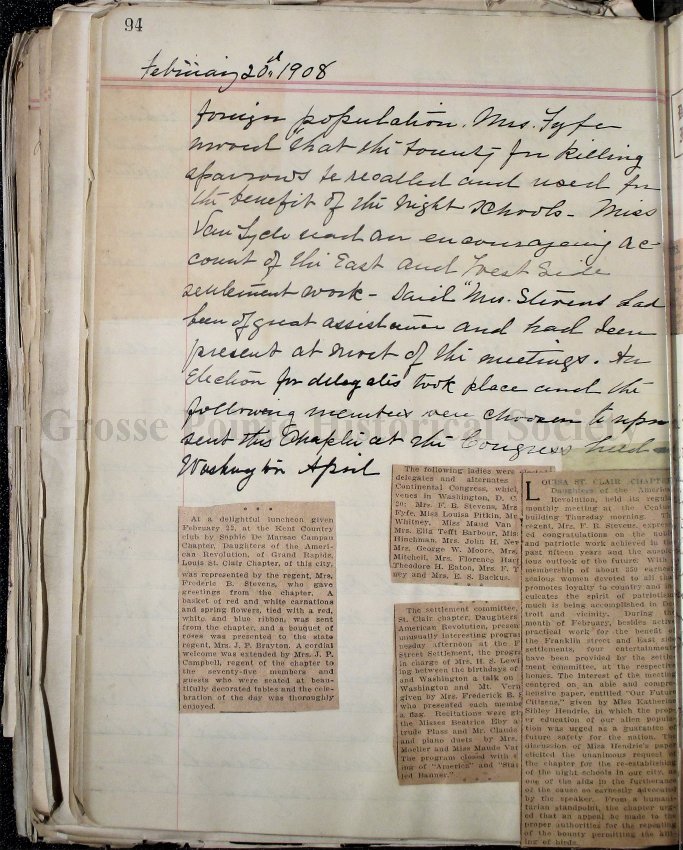 93, 94 Report of the February 20, 1908 meeting, with newspaper reports.