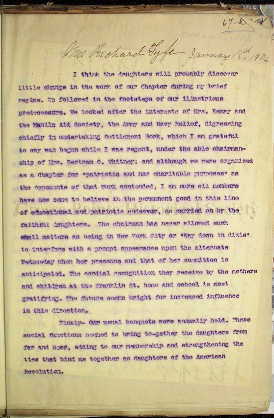 67-a through 67-g Reports read at the January 18, 1906 Anniversary meeting, as follows: Mrs. B. C. Whitney of the Settlement Committee, which has sponsored for the fourth year, a series of patriotic talks for the foreigners of the Franklin St. Settlement; Mrs. Eugene Gibbs, Past Regent; Mrs. William Chittenden, Past Regent and present State Regent; Mrs. Crapo-Smith, Past Regent; Mrs. Richard H. Fyfe Past Regent; Mrs. Connor, Past Regent; and Miss Katherine S. Hendrie for the Charter Members.