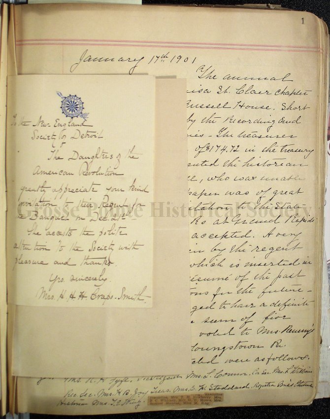 Mrs. Crapo-Smith’s “address”, read at the Annual Meeting January 17, 1901, and her invitation to a Tea at her home in the late afternoon of the same day, “to meet the newly elected officers for 1901”.