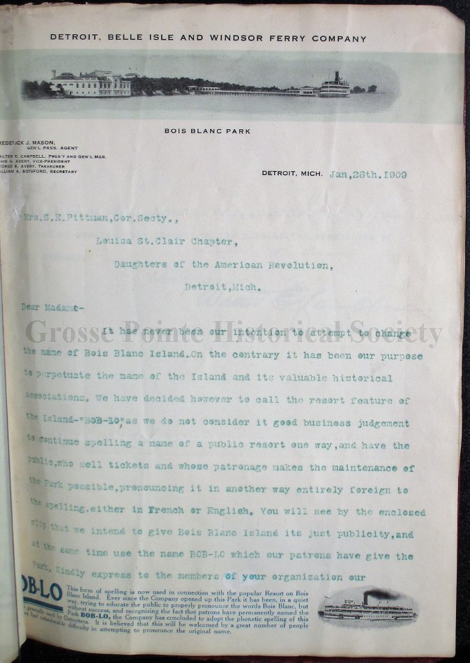 Replies to the Corresponding Secretary to protests sent to the changing of the name of Farrar (or Broadway) Street, and of the rumored change of the name of Bois Blanc Island.