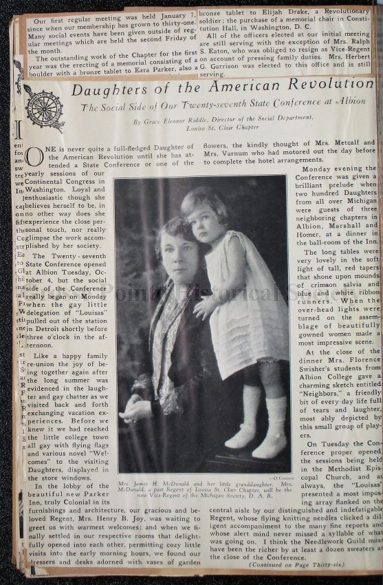 034 Clipping, “The Social Side of Our Twenty-seventh State Conference at Albion,” with photo of Mrs. James H. McDonald and her granddaughter.