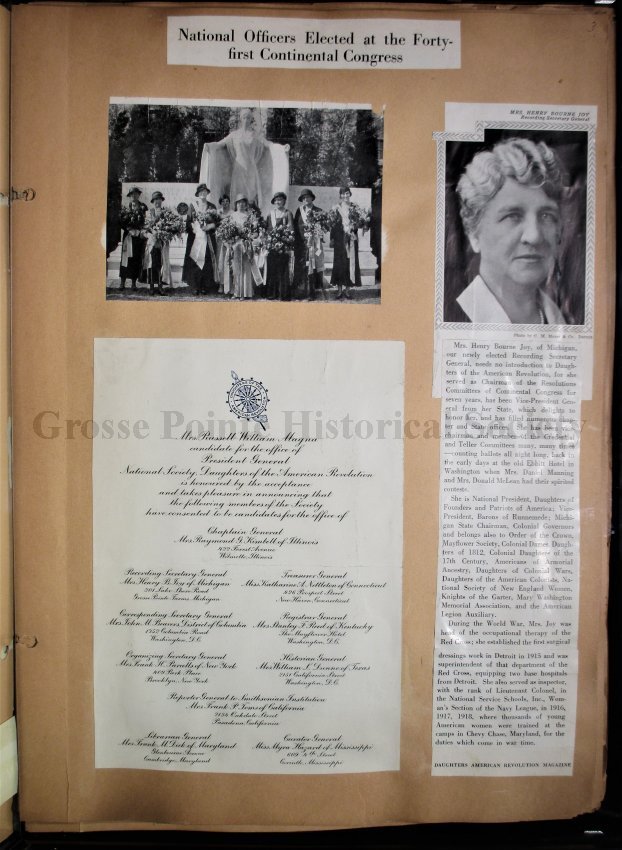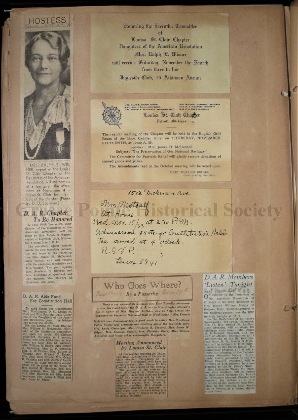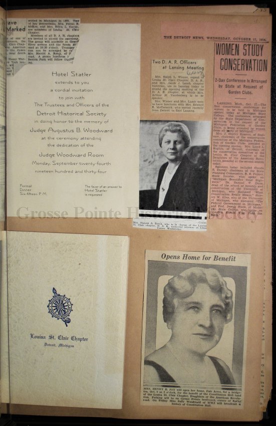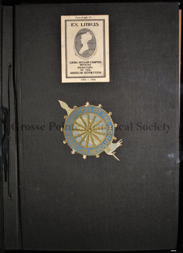 This scrapbook is part of the Louisa St. Clair Chapter, DAR Scrapbook Collection. This collection is owned by the Louisa St. Clair Chapter, DAR, and is housed at their climate-controlled storage unit in Grosse Pointe, MI.