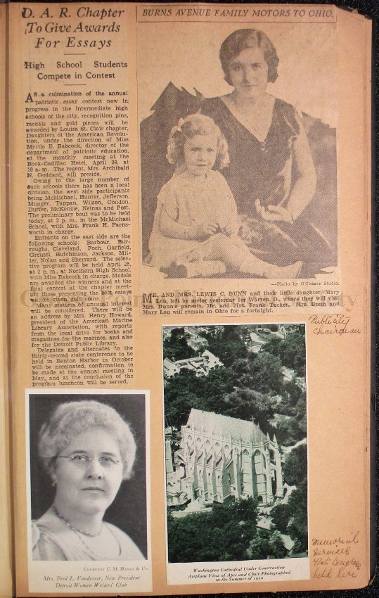 037 Clippings re: Louisa St. Clair Chapter interests, including essay contest, with photos of Mrs. Lewis C. Dunn and daughter Mary Lou, Mrs. Fred L. Vandever, and Washington Cathedral.