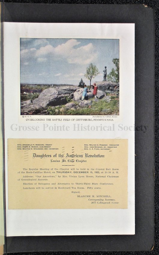 053 Clipping, photo “Overlooking the Battle Field of Gettysburg, Pennsylvania”; postcard invitation to DEC 1932 Louisa St. Clair Chapter meeting.