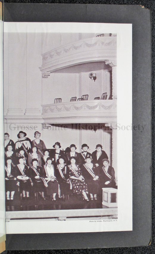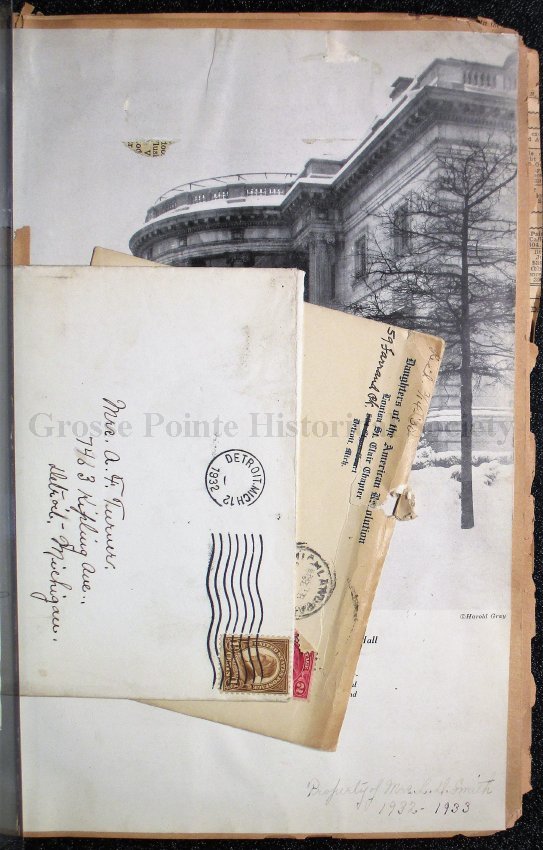 This scrapbook is part of the Louisa St. Clair Chapter, DAR Scrapbook Collection. This collection is owned by the Louisa St. Clair Chapter, DAR, and is housed at their climate-controlled storage unit in Grosse Pointe, MI.