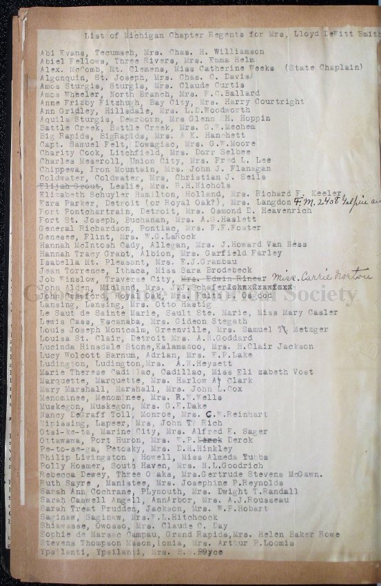 024 Typed document, “List of Michigan Chapter Regents for Mrs. Lloyd DeWitt Smith” with handwritten edits.