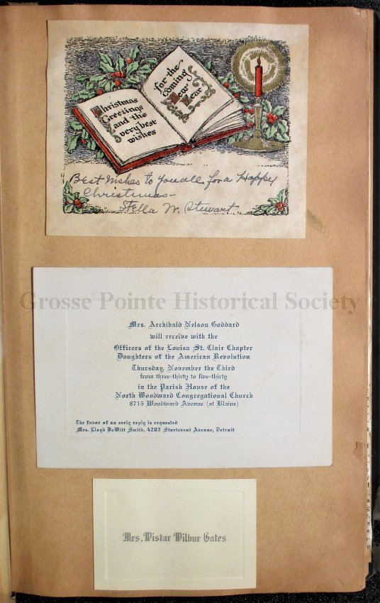 019 Christmas card from Stella W. Stewart; announcement of reception given for officers of Louisa St. Clair Chapter; name card, Mrs. Wistar Wilbur Gates.