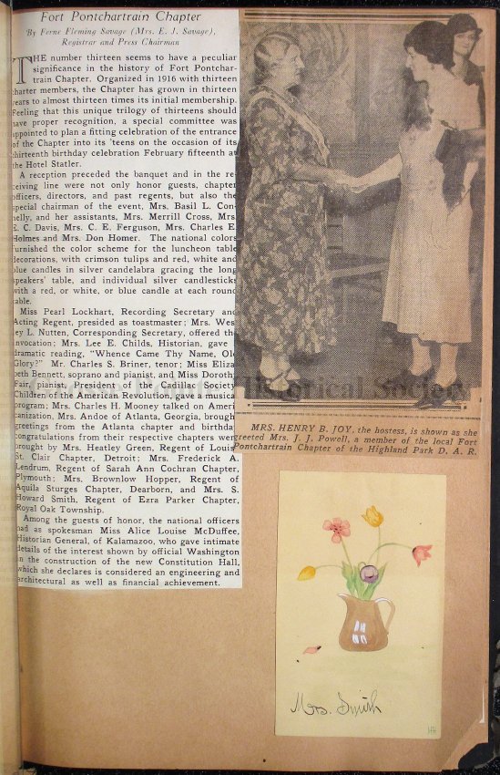 041 Clippings re: Louisa St. Clair Chapter activities, with photo; clipping re: Fort Pontchartrain Chapter; hand-painted name card, Mrs. Smith.