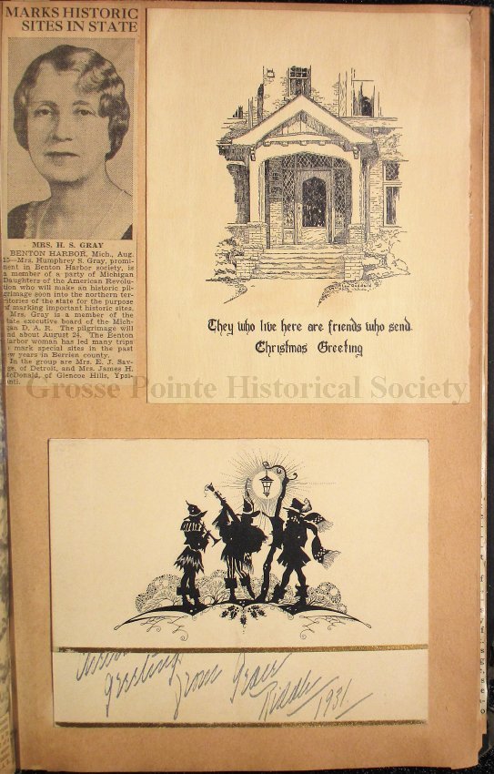 023 Clipping, “Marks Historic Sites in State” with photo of Mrs. H. S. Gray; Christmas cards.
